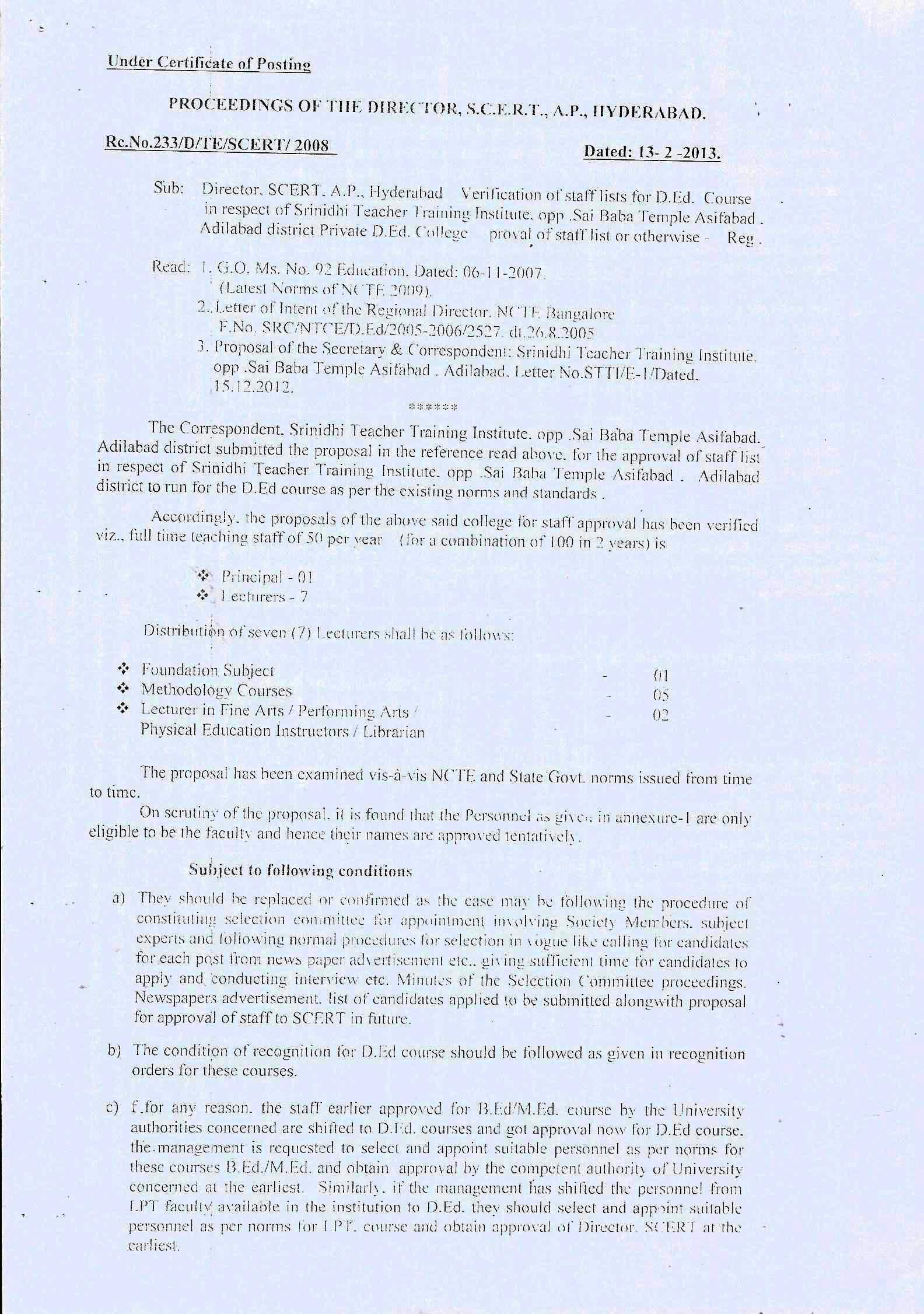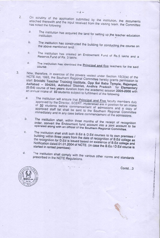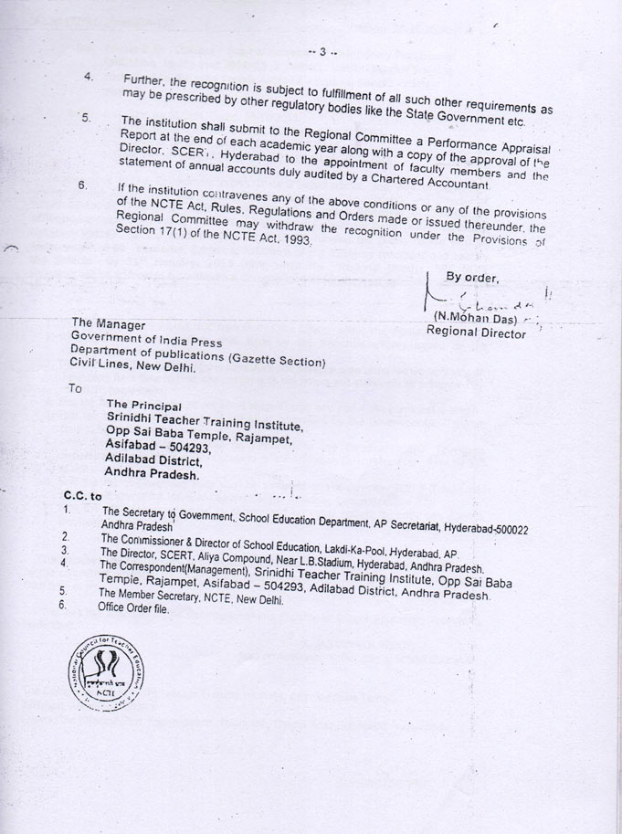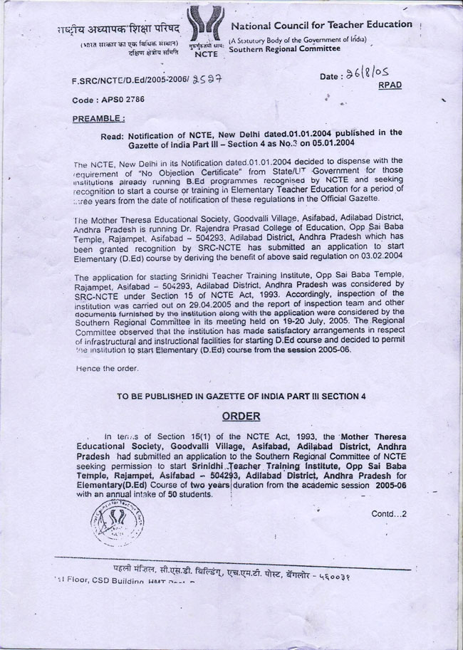 Srinidhi Teacher Training Institution Asifabad Dist. Adilabad is recognized by the NCTE, SRC Bangalore vide F.SRC/NCTE/D.Ed./2005-2006/2527 Dt.26.08.05 and has been granted renewal of affiliation by the Govt. of A.P. School Education dept. through G.O Rt. No. 1007 Dt.30.09.2013