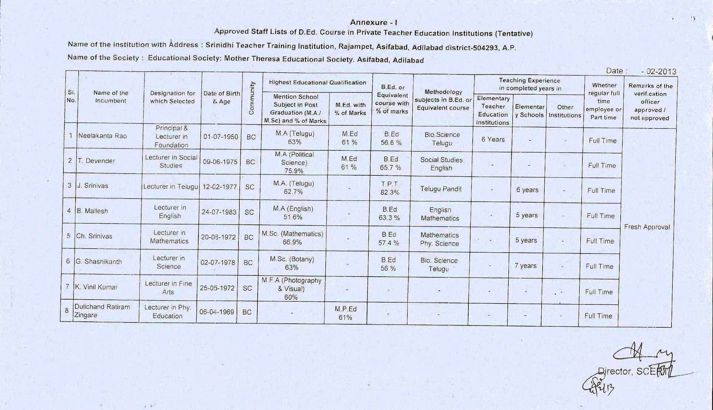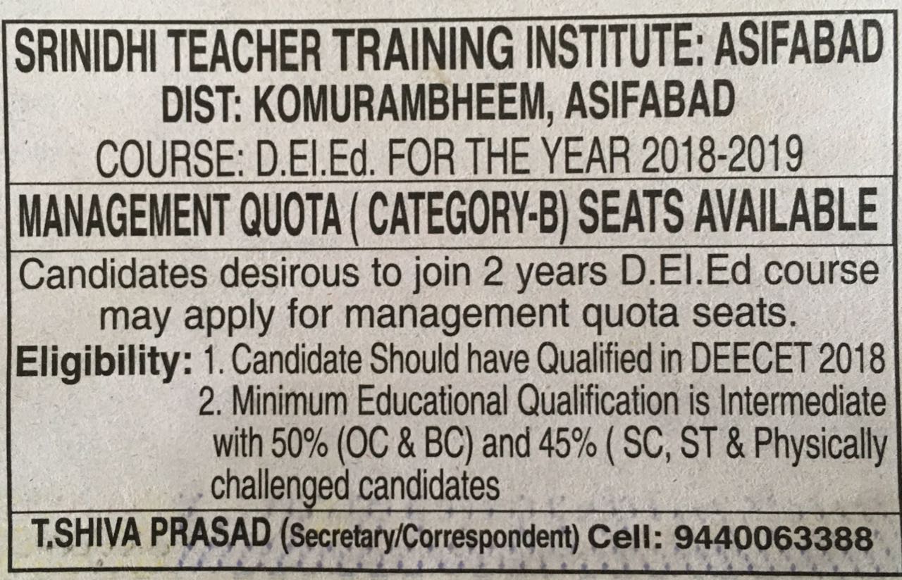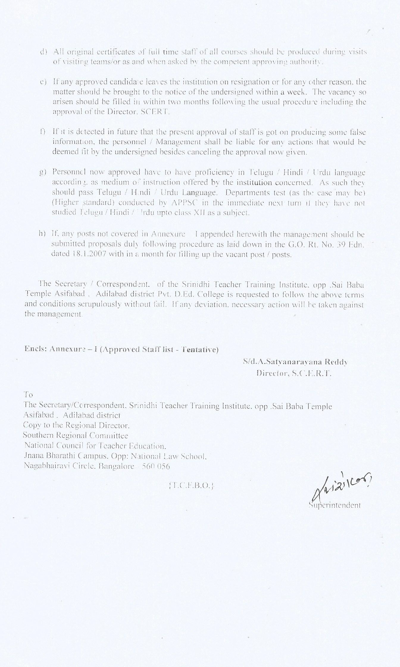 Srinidhi Teacher Training Institution Asifabad Dist. Adilabad is recognized by the NCTE, SRC Bangalore vide F.SRC/NCTE/D.Ed./2005-2006/2527 Dt.26.08.05 and has been granted renewal of affiliation by the Govt. of A.P. School Education dept. through G.O Rt. No. 1007 Dt.30.09.2013